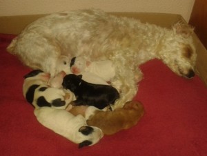 Algo más de dos meses después, completamente curada, parece que no tardará en volver a caminar sin cojear, porque aunque sigue evitando apoyar la pata, pienso que es más por el dolor que le quedó en su cabeza que por el dolor físico. Aun le asustan los ruidos fuertes y mucho la oscuridad. El rugido de las motos la paraliza. Se niega a pasar por encima de los husillos para desagüe en la calle. Y detesta salir si llueve. Como todos los perros, sabe poner esa carita para conseguir lo que quiere mientras mueve nerviosa su cola. Y aunque llevamos poco de conocernos, sabemos que nos tendremos siempre. Ha sufrido mucho, ha pasado mucho miedo y dolor, me atrevería a decir que incluso desde antes de su accidente. Por eso, hoy nos alegramos de tenerla en casa. Y por eso, buscamos familias para sus siete cachorros. Sí. El pasado 6 de diciembre nacieron nueve pequeños, siete de ellos están creciendo sanos y fuertes. La rescatamos ya embarazada. ¡Sorpresa!. Claro que no lo sabíamos, hasta que su barriga comenzó a crecer durante los dos meses de curas, pinchazos, escayola, operación para retirar el clavo y muchos cuidados, finalmente una ecografía nos confirmó lo que venía.