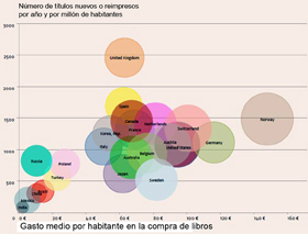 El cuadro siguiente es muy pedagógico. El eje de abscisas representa el importe medio que cada persona de un país gasta cada año en libros; y el eje de ordenadas, el número de títulos nuevos o reimpresos que se publican anualmente en cada país por cada millón de habitantes. La primera conclusión es que el mercado del libro está concentrado en un pequeño número de países que poseen cultura europea o anglosajona, además de Japón y Corea.