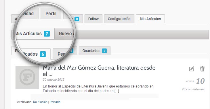 En el primero se guardan todos tus Artículos, Publicados, Guardados y Pendientes (esto significa que aún no ha sido revisado por los administradores). Si quieres Publicar un Nuevo Artículo seleccionas esta opción y se abrirá un cuadro de texto.