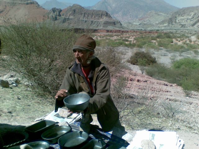 Emprendimos el camino a Cafayate e hicimos una parada en el Anfiteatro que es un grupo de formaciones rocosas imponentes que están ubicadas en forma semicircular con un hueco en el medio. Te sientes una hormiga entre montañas y llega un momento en que está casi oscuro porque el hilito de luz que entra por algún pliegue de las montañas es mínimo. Al costado del camino, lugar donde estaban estacionados los ómnibus de excursiones de distintos países, se encontraba un artesano lugareño, un señor muy mayor que había desparramado sus artesanías sobre una mesa rudimentaria. La expresión de ese hombre, las arrugas de su cara por las inclemencias climáticas y por la edad, quedaron grabadas en mi retina. Tenía una llama que era la admiración de todos los turistas que querían ser fotografiados con ella. No presté atención a la llama, sino a la figura de ese hombre, sus manos y su cara resecas por la falta de hidratación y su mirada perdida en el horizonte